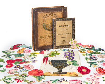 London: Published by J(ohn). Burgis; W. Sams; Hodgson & Co., (1824). Superior Edition. Comprising 67 hand-colored cut-out paper flowers and leaves; four paper-covered cards with hand-colored printed floral designs (each measuring 10 3/8 x 8 5/8 in.; 263 x 219 mm), each with slits for the insertion of above cut-out flowers (one with original blue ribbon on verso, for hanging); one printed instruction booklet, 8vo, 16 pp., with seven illustrations (five folding) and hand-colored shading and coloring guides (paper watermarked 1823); numerous wooden spillikins for the affixing of cut-outs to cards. Housed in original hand-colored pictorial paperboard box, worn and rubbed; scattered wear and soiling to cut-outs and cards. OCLC 563486514 and 9330972