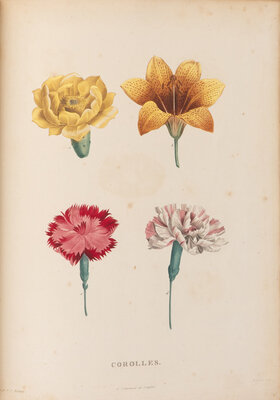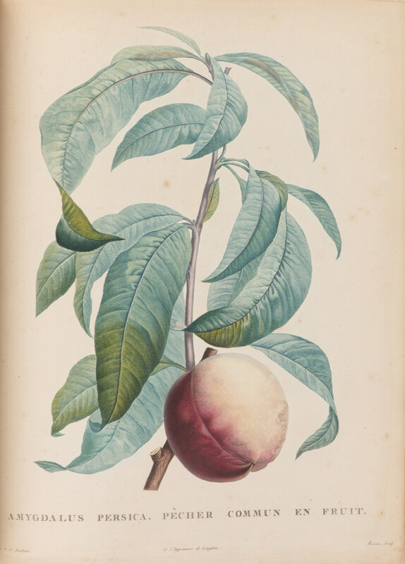 Paris: Baudouin Freres, 1822. Third edition. Large 4to (368 x 279 mm). Half-title, engraved title-page; 65 stipple-engraved plates printed in colors and finished by hand by Bouquet, Chailly, Delelo, etc., after Pierre Joseph Redoute, spotting, marginal toning. Contemporary straight-grain green morocco gilt, uncut, rebacked, preserving original spine, lower cover and spine detached, renewed endpapers. Dunthorne 252; Great Flower Books p. 74; Nissen BBI 1688; Stafleu TL2 9688.