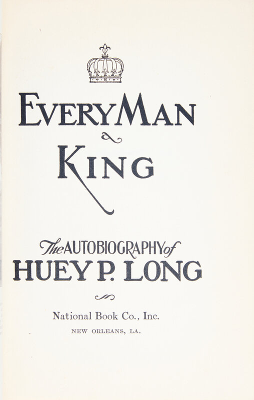 First edition presentation copy of controversial Louisiana Senator Huey P. Long's autobiography, published just two years before his assassination in 1935.