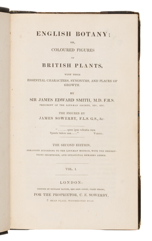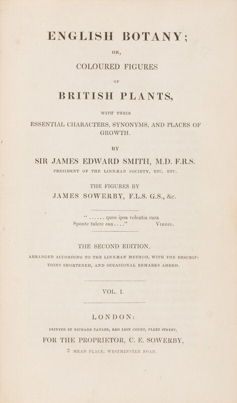 English Botany was conceived, illustrated, and published by James Sowerby with the assistance of Linnean Society founder Sir James Edward Smith. Smith wrote the technical descriptions of each plant specimen, but declined to be named as co-author--due to Sowerby's lower social status--until after the work became a success. "English Botany is of value even to the present day as a work of reference, and as an illustrated flora of our country it has never been surpassed" (Henrey, p. 143).