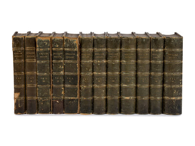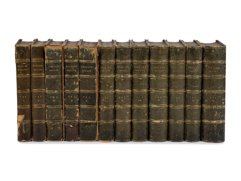 London: Richard Taylor for C.E. Sowerby, 1832-[1846]. Second edition. 12 volumes, 8vo (218 x 133 mm). Numerous hand-colored plates (foxing throughout, some offsetting.) Late 19th century olive half morocco with spines in 6 compartments; significant rubbing, front boards on volumes III and V detached but present, minor losses along extremities; bookplates of British industrialist Sir Arthur John Dorman, 1st Baronet.