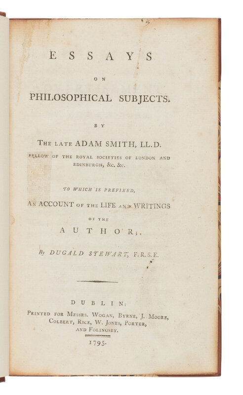 Printed in the same year as the first London edition. Essays on Philosophical Subjects comprises a series of essays gathered together by Smith's literary executors, Joseph Black and James Hutton, which they believed to have once been intended for a longer work on a history of the liberal sciences. A short biographical account by Dugald Stewart included here was one of the first ever printed about the life of Adam Smith.