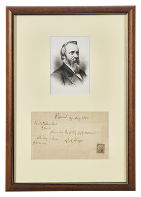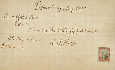 Fremont, (Ohio), August 29, 1873. One sheet, approximately 4 3/4 x 7 3/4 in. (121 x 197 mm) (sight). Autograph letter, signed by future President Rutherford B. Hayes, directing the the First National Bank of Fremont to pay $50 to Mr. Colby. Creasing from old folds; contemporary two-cent stamp at bottom right. In mat with a portrait of Hayes, and in frame, 18 1/2 x 13 in. (470 x 330 mm).
