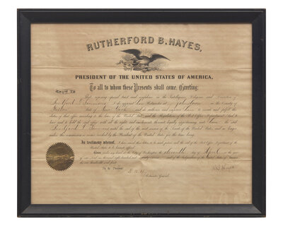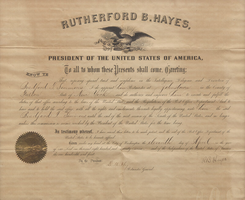 Washington, D.C., April 11, 1877. Single oblong sheet, approximately 13 3/4 x 16 1/2 in. (349 x 419 mm) (sight). Partially-printed commission, signed by Rutherford B. Hayes, appointing Bradford T. Simmons Postmaster at Johnstown, New York; counter-signed by Postmaster General David M. Key. Gilt seal intact in bottom left. Creasing from old folds, short closed tear at bottom central fold; dampstaining in bottom right corner. Unexamined out of frame, 15 3/4 x 18 5/8 in. (400 x 473 mm).
