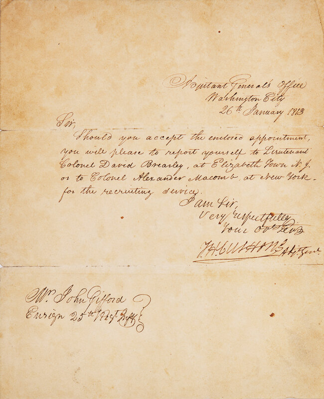Accompanied by an autograph letter signed by Adjutant General of the United States Army, Thomas H. Cushing (1755-1822), dated January 26, 1813, transmitting Gifford's appointment and orders.