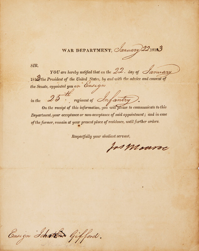 War Department (Washington, D.C), January 22, 1813. Bifolium, 10 x 7 1/2 in. (254 x 191 mm). Partially-printed document, signed by James Monroe as Secretary of State, appointing Johnathan Gifford an Ensign in the 25th Regiment of Infantry. Contemporary docketing on verso. Creasing from old folds, two small closed tears along same; scattered foxing; tape residue on last page from when mounted.