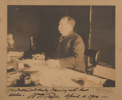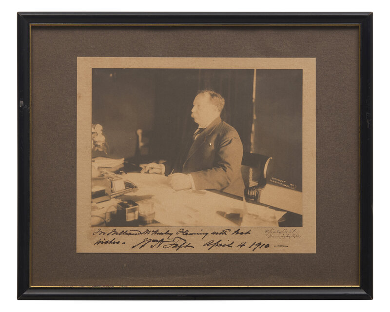 Washington, D.C., April 4, 1910. Photograph of William H. Taft, inscribed by him below image, "For ____ ___ ____ with best wishes-Wm H Taft April 4 1910--". Clinedinst copyright in image at right, dated 1909; signed by photographer Clinedinst below image at right. Photograph mounted to sheet, approximately 6 1/2 x 8 3/4 in. (165 x 222 mm). Unexamined out of frame, 12 x 14 1/2 in. (305 x 368 mm).