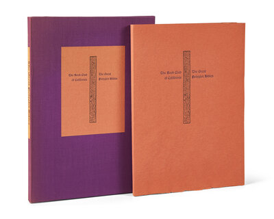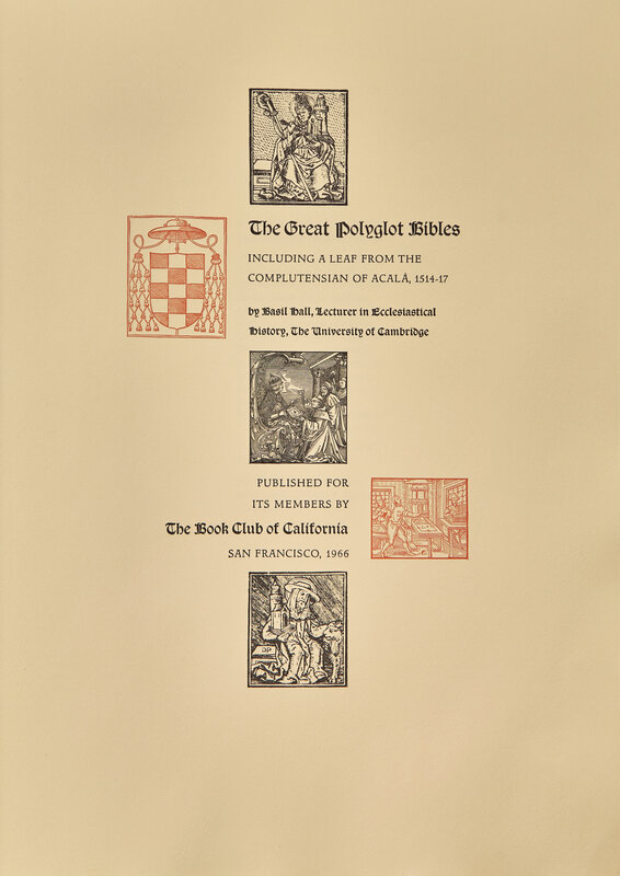 San Francisco: (printed by the Allen Press for) The Book Club of California, 1966. Limited edition, one of 400 unnumbered copies. Folio. Leaves loose as issued; original polyglot text leaf from the Complutensian of Acalá tipped in at front. In original orange handmade printed wrappers; in original purple cloth fall-down-back box, printed orange cover label.