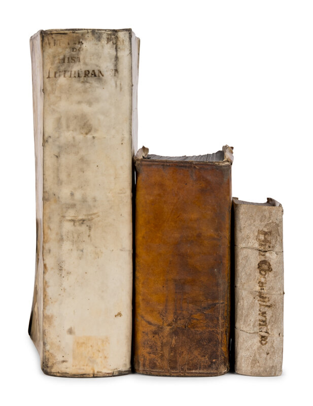 Commentarius Historicus et Apologeticus de Lutheranismo, sive de Reformatione Religionis ductu D Martini Lutheri in Magna Germaniae. Libri Tres. Frankfurt and Leipzig: Johann Friedrich Gleditsch, 1692. Contermporary full vellum; soiling, some page edges restored, large dampstain to interior of rear board.
