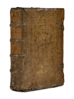 [Nuremberg]: In Officina Ioannis Montani and Vlrici Neuberi, 1558. 2 volumes, folio (317 x 203 mm). (Worming throughout second volume, penciled notations throughout, spotting, large section of front free endpaper torn.) Both volumes in contemporary full alum-tawed pigskin over wood with beveled edges and spines in 5 compartments with 4 bands, elaborately blind-tooled with remnants of clasps; second volume similarly bound with metal clasps and metal corner guards, pigskin loose over boards, soiling, lacking five metal corner guards of second volume. Ownership stamp of Neander Library, Rochester Theological Seminary; (signature?) American businessman Roswell S. Burrows. Adams H1207; VD16 H6154.