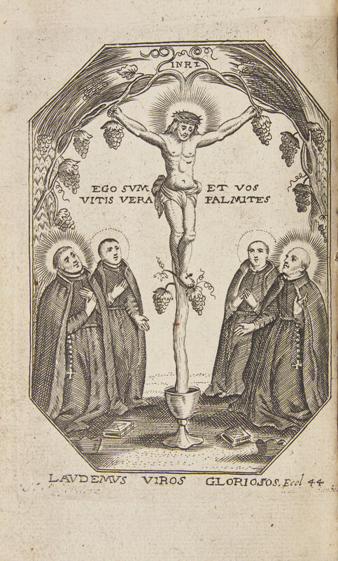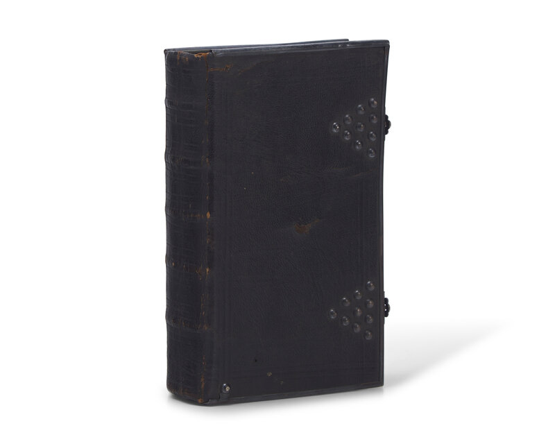 Antwerp: Joannes Verdussen, (ca. 1760s). 12mo. (xiv), 547, (5) pp.; signature V (pp. 305-320) in duplicate. Illustrated with an engraved frontispiece. Full black pigskin, metal ornaments and clasps (with "PNSS" engraved on verso of bottom clasp); all edges gilt; marbled endpapers; book-plate on front blank. OCLC 13528936