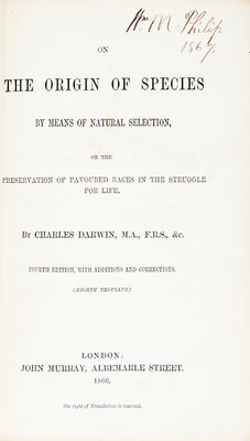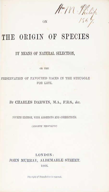 Fourth edition of Darwin's seminal work on evolution. One of 1,500 copies printed, and with extensive alterations.