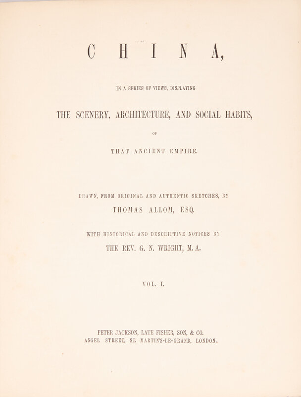 [Travel & Exploration] Allom, Thomas, and the Rev. G.N. Wright. China, In A Series of Views, Displaying The Scenery, Architecture, And Social Habbits, of That Ancient Empire