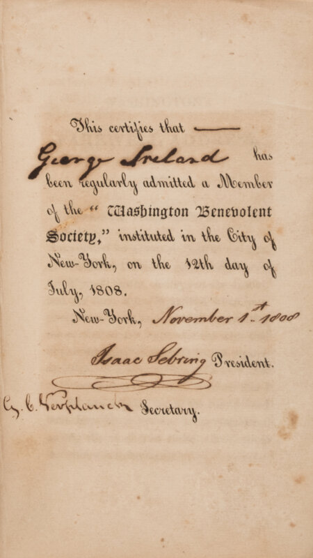 Together with Washington Benevolent Society silk ribbon pinned to front free endpaper.