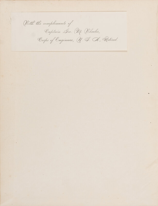 "Representing the U.S. Army Corps of Engineers, Wheeler surveyed some 361,000 square miles of the southwest between 1869 and 1979…Wheeler's primary objective was to prepare a detailed topographic map of the West. In pursuit of this goal he divided the area of the West into ninety-five 'principal' rectangles, each rectangle comprising 2 degrees 45' minutes of longitude and 1 degree 40' minutes of latitude, to be covered in four atlas sheets." (Schwartz & Ehrenberg, pp.304-306).