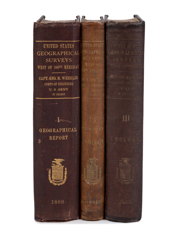 Washington, D.C.: Government Printing Office, 1889, 1875, 1881. Together, 3 volumes: Vols. 1 (Geographical Report), with presentation slip from the author, 3 (Geology), and a supplement to Geology only, 4to. Numerous plates and folding maps. Faint dampstain throughout in supplement volume. Original brown cloth, gilt-lettered spines. book-plate George S. Morison.