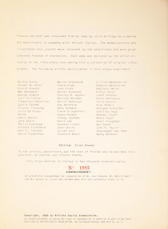 Scarce first publication issued by the Artists Equity Association, that was "conceived from an idea by Julio de Diego as a medium for advertisers in sympathy with Artists Equity. The member-artists who illustrated this journal were selected by the advertisers and were given complete freedom of expression."