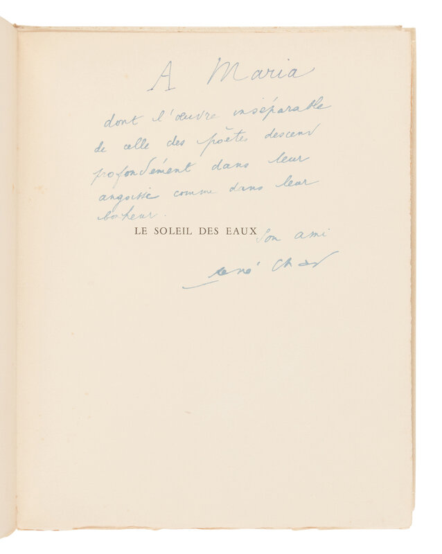 Paris: Henri Matarasso, 1949. First and limited edition, #179/200 copies, signed by Braque and char, with an additional inscription in French from Char to Maria Martins, "To Maria, whose work is inseparable from that of the poets who descend as deeply into their anguish as into their good fortune." 4to. Color aquatint frontispiece with 3 black and white aquatints in text, minor spotting along margins, offsetting; Loose sheets as issued in folded cardboard cover; publisher's slipcase, rubbing, soiling, hinges starting. Vallier 47.