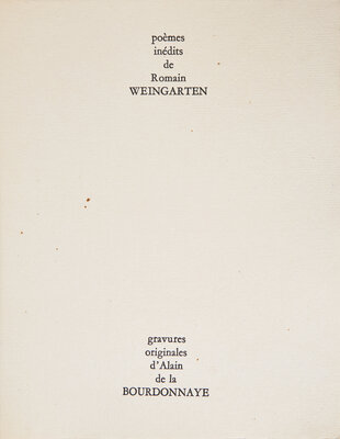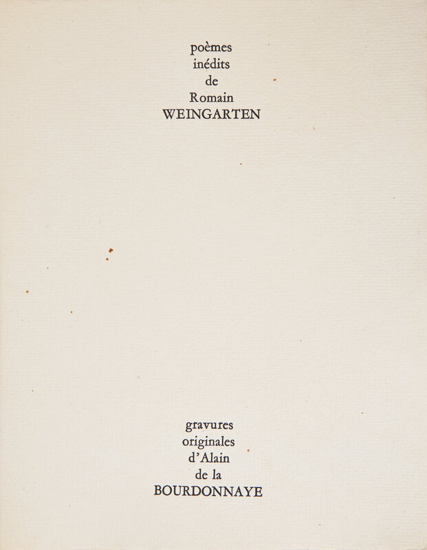 (Paris, ca. 1960). First and limited edition, #XVII/XL numbered copies (from a total of 52), signed by Weingarten and Bourdonnaye. Folio. Illustrated with eight etchings by Bourdonnaye (including one double-page). Sheets loose as issued in original stiff printed wrappers, front wrapper with etching by Bourdonnaye; in custom slip case.