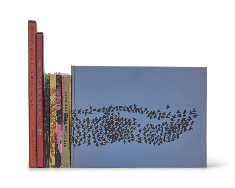 New York, etc.: The Spiral Press, etc, 1954-65. In seven volumes (comprising: 12 Fables of Aesop, 1954; Woodcuts by Antonio Frasconi, 1957; Birds From My Homeland, 1958; The Face of Edgar Allan Poe, 1959; A Whitman Portrait, 1960; Bestiary/Bestiario, 1965; A Vision of Thoreau, 1965). Limited editions, each of a various limitation and each signed on the colophon by Frasconi. Each volume illustrated with woodcuts by Frasconi. Each in original cloth or paper-covered boards; some in slip case.