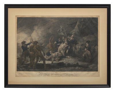 London: A.C. de Poggi, March 1798. Hand-colored engraving, by J.T. Clemens after John Trumbull. Approximately 22 3/4 x 31 1/4 in. (578 x 794 mm) (sight). In mat and unexamined out of frame, 30 7/8 x 39 1/4 in. (784 x 997).