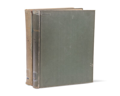 Paris: Editions Albert Skira, 1933-39. In two volumes; comprising Nos. 1, 2, 3/4 (double issue), 8, 9, 10, 11, and 12/13 (double issue). Profusely illustrated. Full library buckram, spine lettered in gilt, worn and soiled, remnants of library labels at foot of each spine; book-plate on front paste-down of each volume; scattered library ink stamps; scattered repairs; moderately soiled and worn; large blank labels mounted on rear paste-down of each volume; original wrappers bound in. Sold not subject to return.