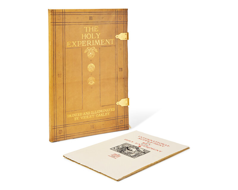 (Philadelphia: Privately Printed, 1922). Limited edition, #317/250 numbered copies of the International Edition, signed by Oakley (from a total of 500), and including the International Supplement and Key to the Holy Experiment laid in. Elephant folio. Text printed in black, red, blue, and in gilt. Illustrated with 22 tipped-in color plates (two folding). Text and plates loose as issued in full tan beveled edged sheepskin portfolio, ruled and decorated in brown, lettered and decorated in gilt, gilt clasps, lightly worn; gilt paper paste-downs; library labels on inner front board; scattered thumb soiling; scattered wear to plates.