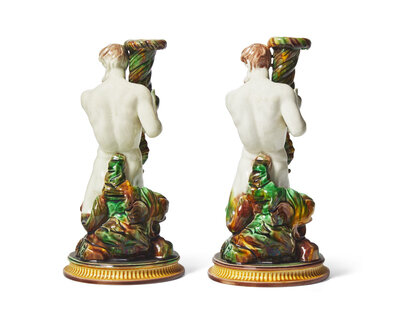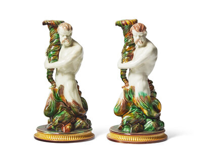 An Assembled Pair of Wedgwood Majolica Assembled Triton Candle Holders