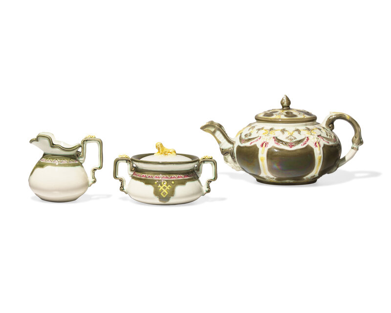 Comprising a teapot, creamer and covered sugar with sphinx finial; impressed Wedgwood stamps.