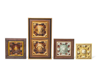 Comprising a framed figural pair in amber and three square tiles with central cabochons, two examples framed.