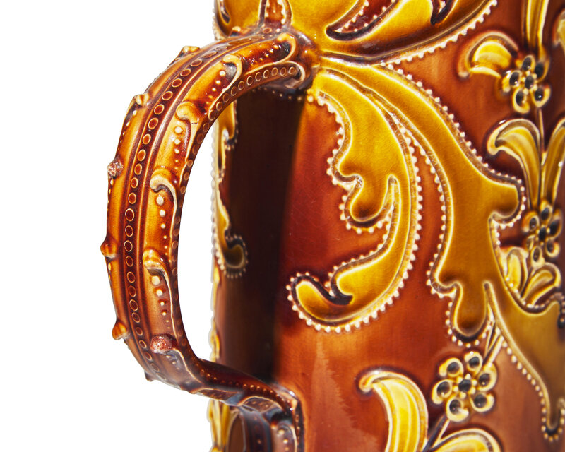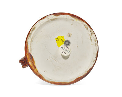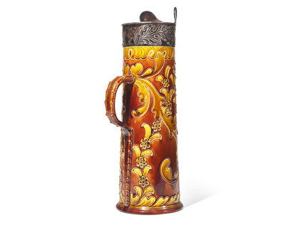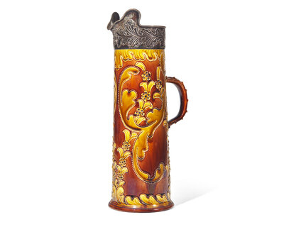 Thrown and decorated by Harry Barnard (1862-1933), Rockingham glaze; impressed Wedgwood stamp and signed “Barnard”, the silver marked “B&F Sterling 850”.