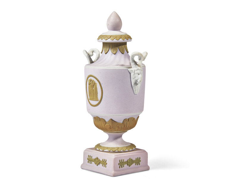 Modeled as a Classical urn with lions' head handles and central medallion; with impressed Wedgwood stamp to underside.