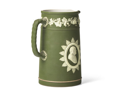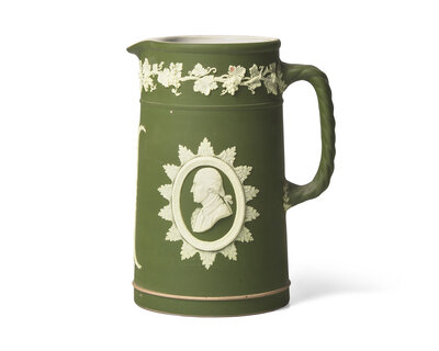 With a grape and vine border with a twisted rope handle above George Washington Medallions, impressed Wedgwood stamp.