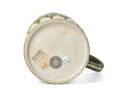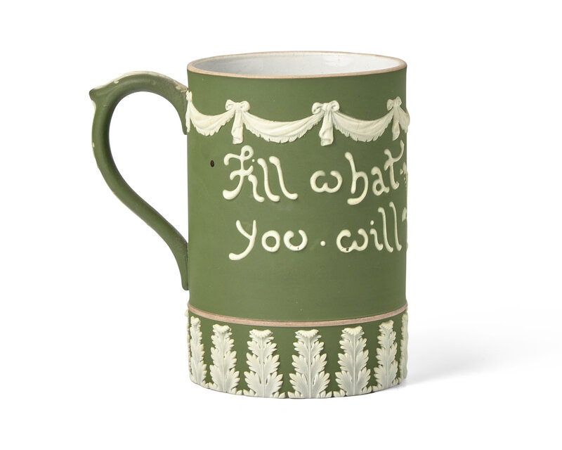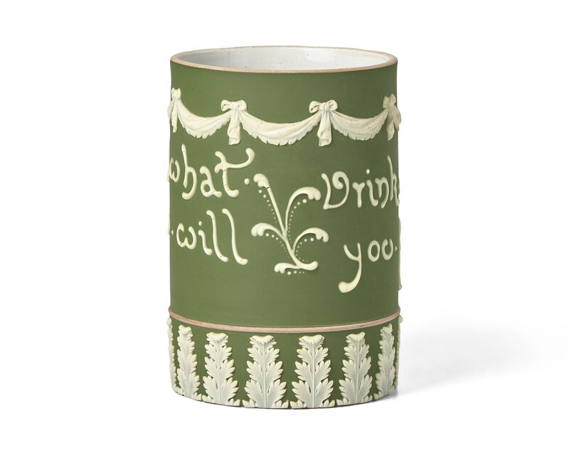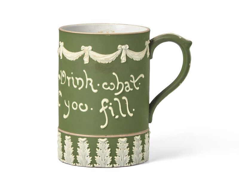 Possibly designed by Harry Barnard, green Jasperware "Drink what you will, Drink what you fill"; with impressed Wedgwood, England and date cypher 'C' for 1900.