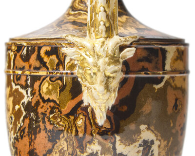 Scrolling handles with rams' head terminals; impressed Wedgwood stamp.