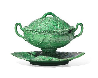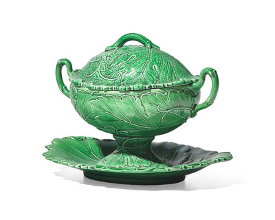 A Wedgwood Majolica Cabbage Covered Sauce Tureen and Undertray