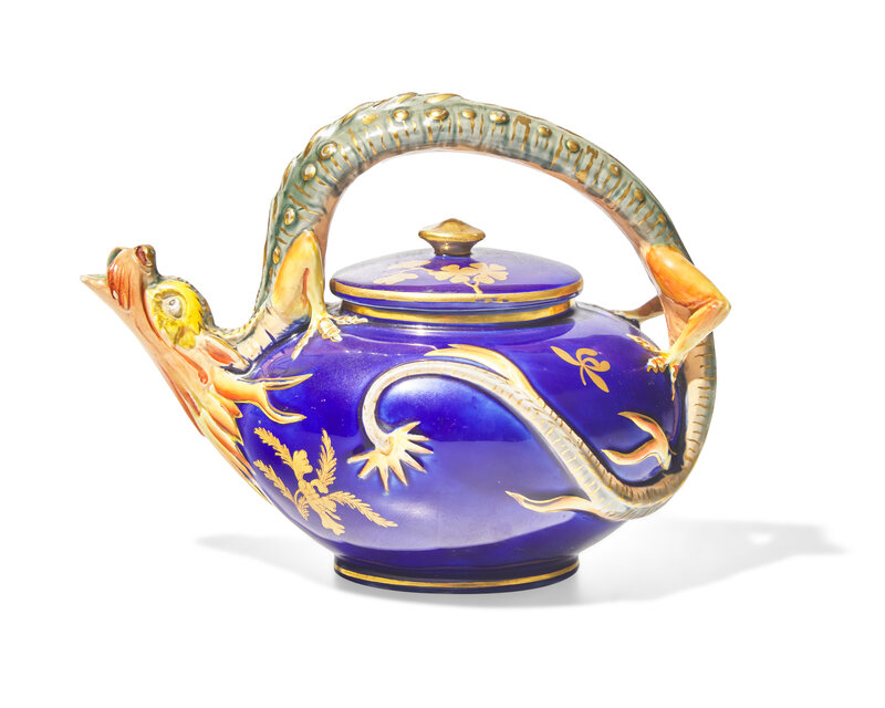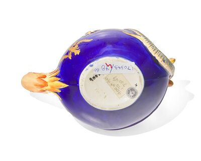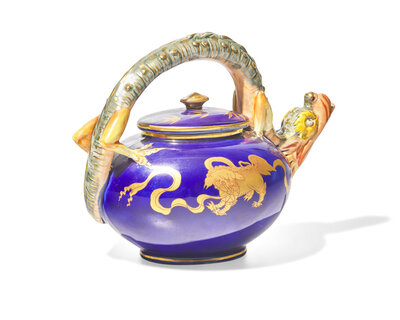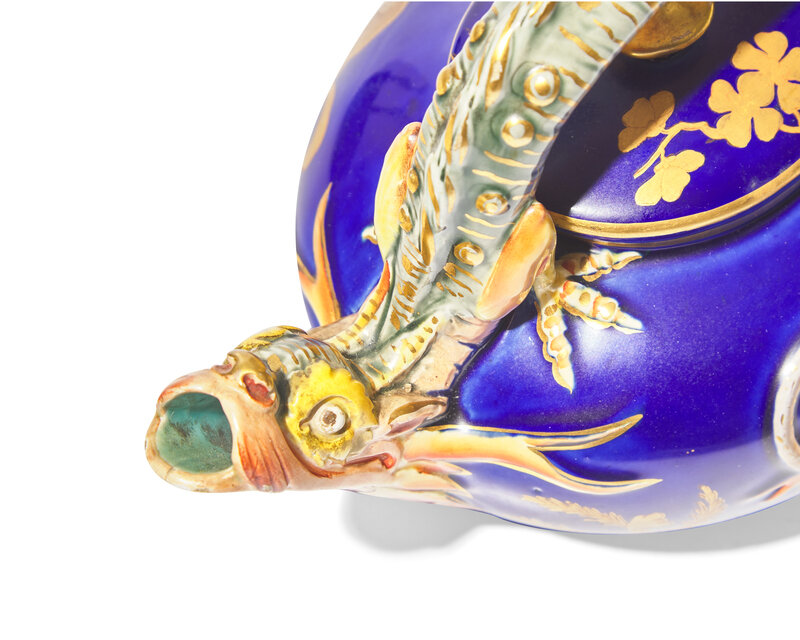 Having a beautifully detailed dragon handle above a gilt decorated blue ground body.
