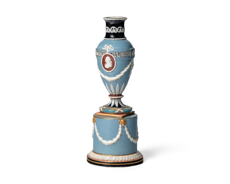 The urn hung with portrait medallion and laurel swags atop plinth base; impressed Wedgwood stamp.