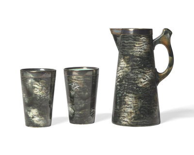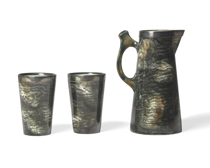 Comprising a pitcher and two tumblers, the glaze simulating horn; the mounts stamped 'H&H', the undersides impressed Wedgwood and with diamond registration mark.