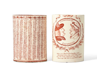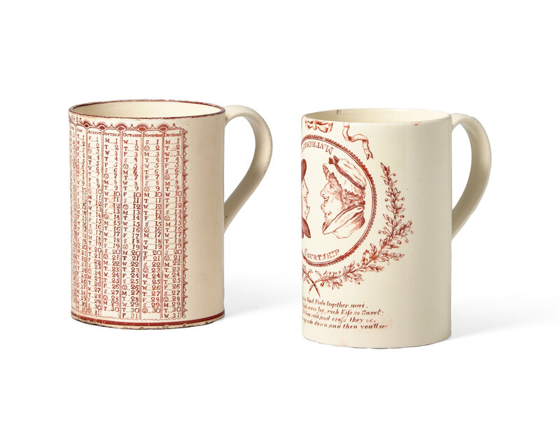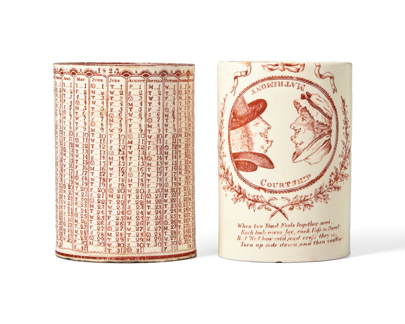 Transfer decorated with an ambigram of a man and woman in a reserve and reading 'Courtship and Matrimony' above a poem reading "When two Fond Fools together meet, Each look gives Joy, each Kiss so Sweet; But wed how cold, and cross they be, Turn up side down, and then you'll see"; together with a transfer printed calendar mug for 1826.