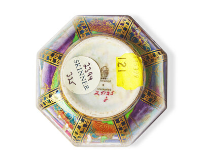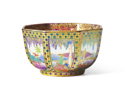 A Small Wedgwood Fairyland Lustre "Castle of the Road" and "Dana" Decorated Octagonal Bowl