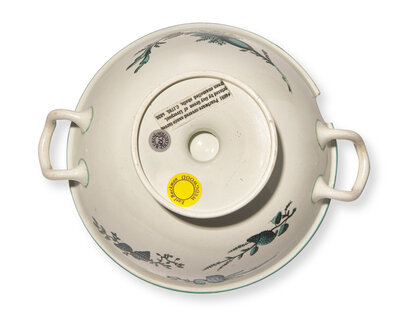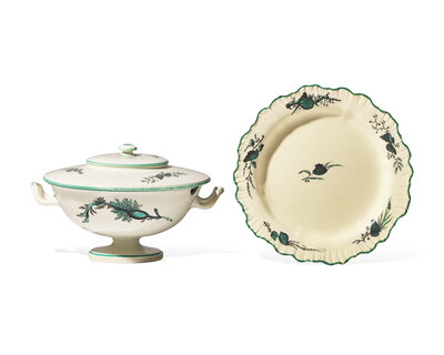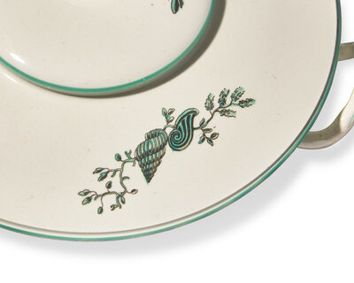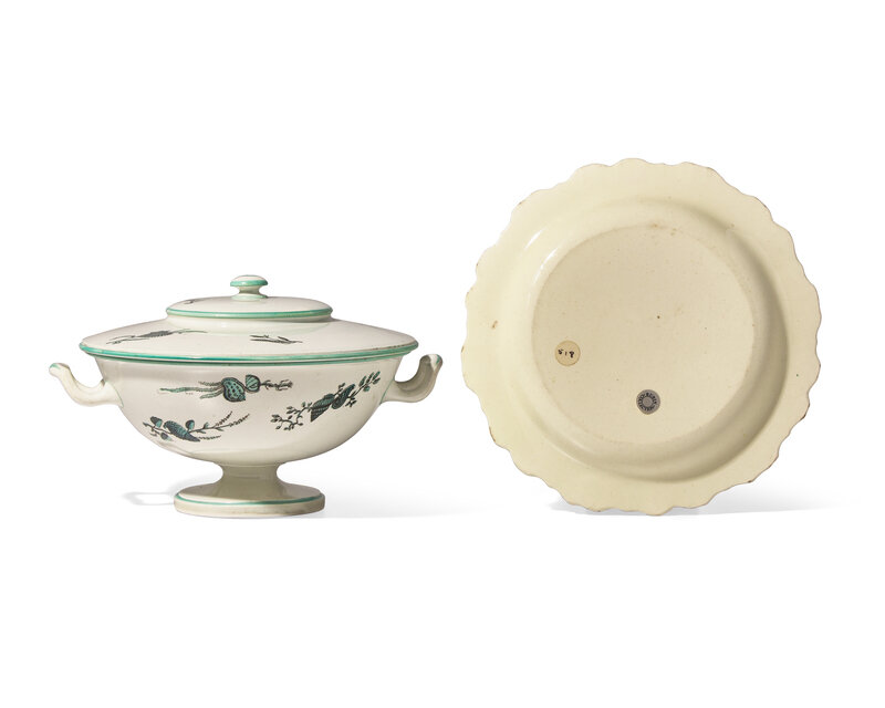 Comprising a dinner plate with cabbage leaf edging and a covered soup tureen, both decorated with a green printed shell motif, likely printed by Guy Green, Liverpool; impressed Wedgwood stamp.