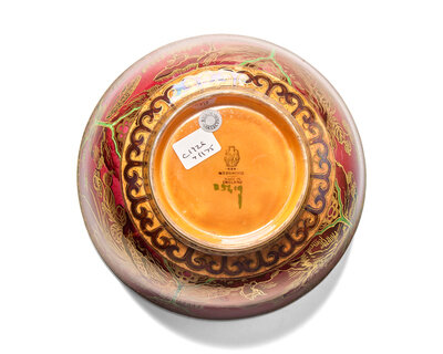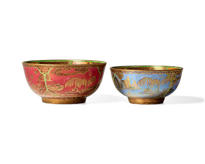 Having exterior ruby and blue panels decorated with a panoramic Chinese-style landscape and floral motifs. Yellow lustre interior overprinted with crimson thorn diaper. Central motif of a Chinese garden bridge leading to a pagoda-roofed house, surrounded by trees and flowers. Border of gilt fretwork ornament, separated by floral sprigs, around both sides of the rim. Rothwell bead decoration around the foot rim.