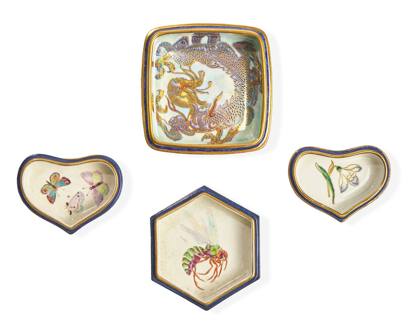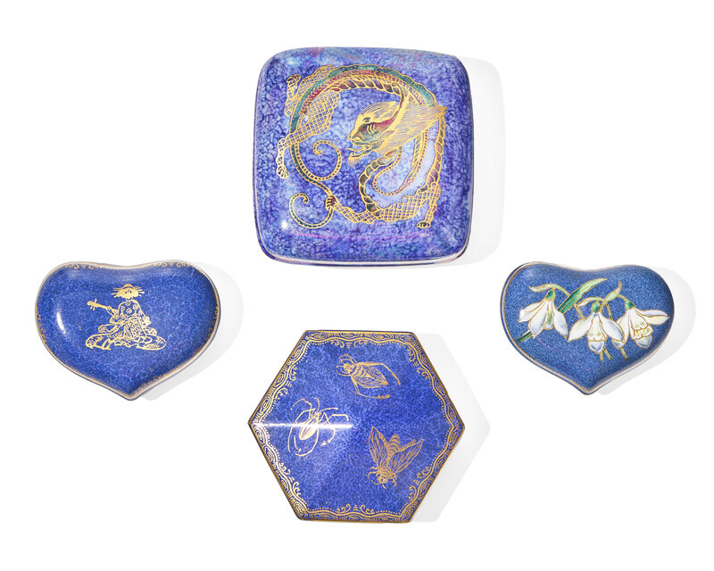 Comprising two heart-shaped boxes with a geisha to lid of one and snowdrops to the other, a hexagonal box with insect motifs to the lid, and a larger four-sided box with dragon to lid; printed Wedgwood marks.