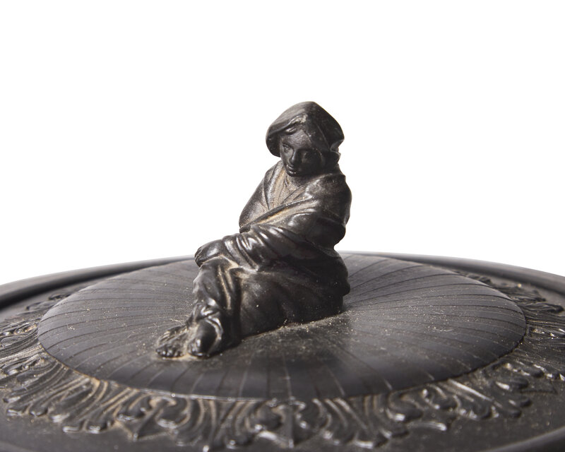 Featuring playful putti in relief and Sybil finial; impressed Wedgwood mark.