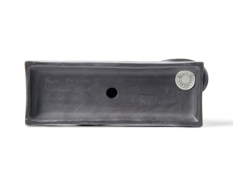 With inscription to underside purporting to once have belonged to Napoleon III, the two Sphinx form inkwells similarly modeled; each with impressed Wedgwood stamps.