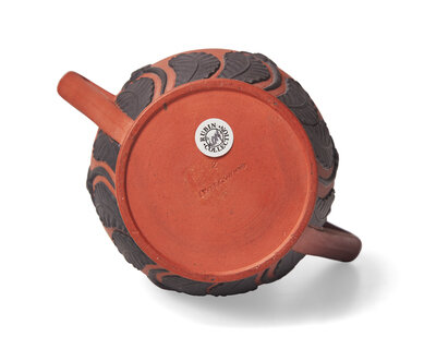 Modeled with black basalt leaf-tips to base and rim; both with impressed Wedgwood stamps.
