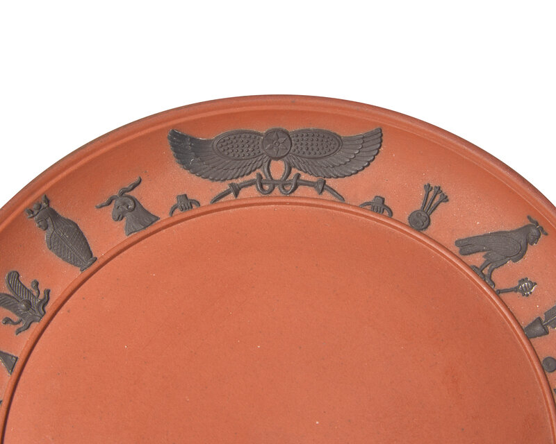 Comprised of three graduated plates, an octagonal bowl and a creamer, all with applied hieroglyphs in relief; impressed Wedgwood stamps.