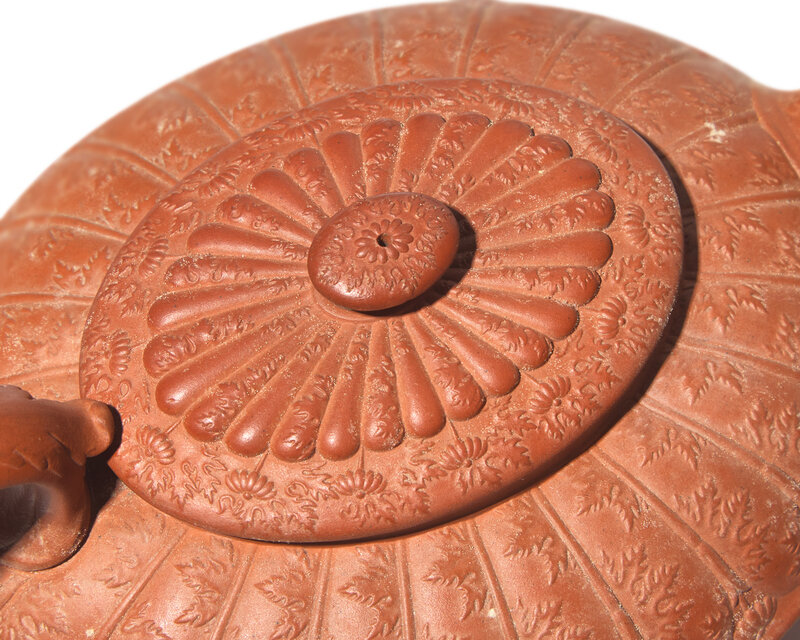 Comprising a leaf molded covered teapot and covered sugar bowl.