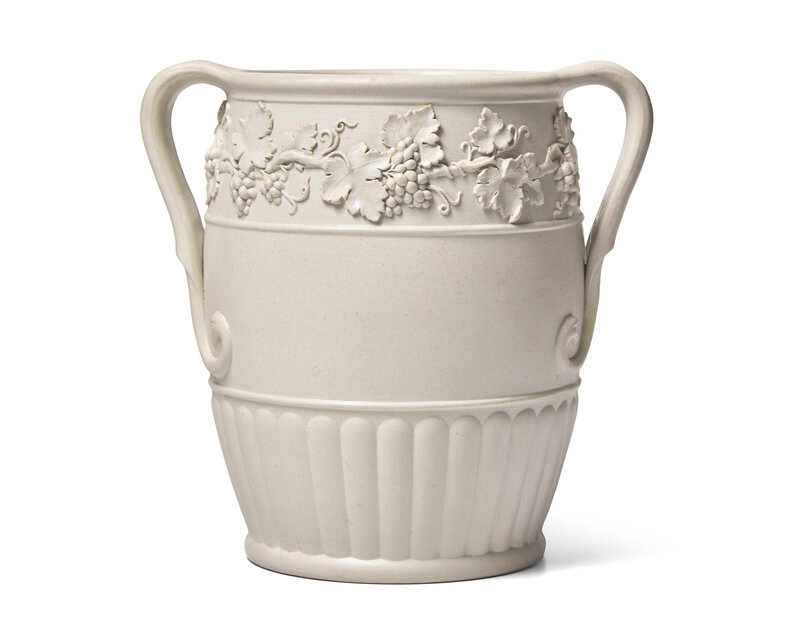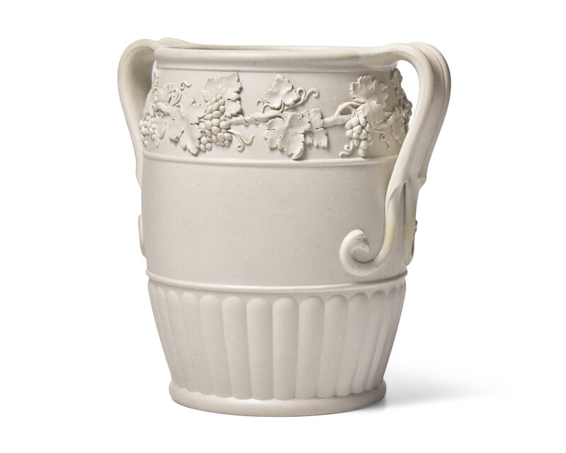 The twin handled body with a grapevine border above a lobed base; impressed Wedgwood stamp to underside.